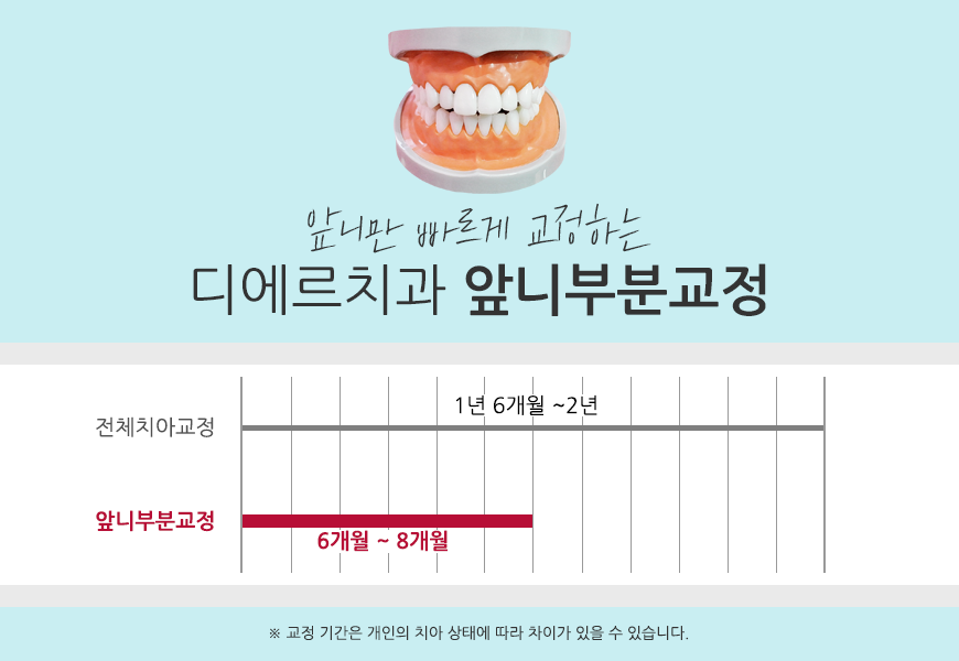이러한 경우 앞니 부분교정, 아랫니 교정, 덧니 부분교정 등 치아 전체를 교정하지 않고 앞니부분만 교정하여