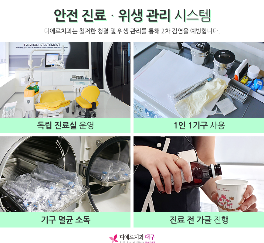 디에르치과는 진료 시 사용하는 모든 기구들은 멸균 소독 과정을 거쳐 2차 감염을 예방하고 1인 1기구 사용 원칙을 준수합니다.