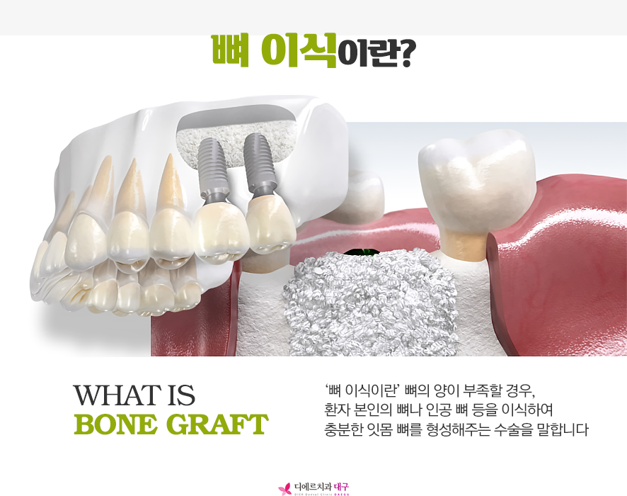 뼈 이식이란 뼈의 양이 부족할 경우, 환자의 본인 뼈나 인공 뼈 등을 이식하여 충분한 잇몸 뼈를 형성해주는 수술을 말합니다.