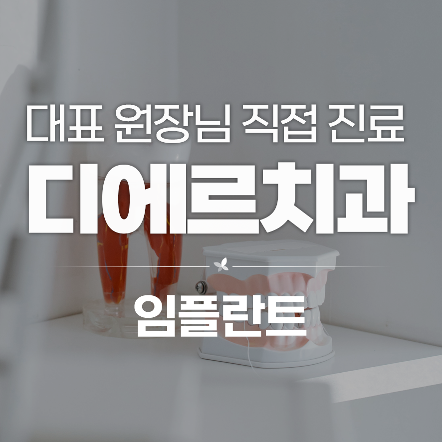 개인 치아의 상태를 면밀히 체크하여 정확한 치료 및 사후 관리까지 진행하는지, 믿을 수 있는 정품 재료를 사용하는지 등을 꼼꼼히 체크하여 결정하는 것이 좋습니다. 디에르치과는 덴티움 임플란트를 사용합니다.