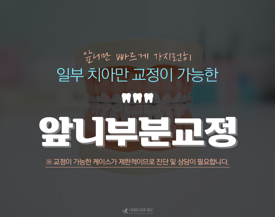 앞니부분교정은 간단 교정 혹은 급속 교정으로도 불리는데, 보통 사소한 앞니의 틀어짐이나 틈이 있는 경우에 그 부분만을 교정하기 위해 하는 치아교정법입니다.