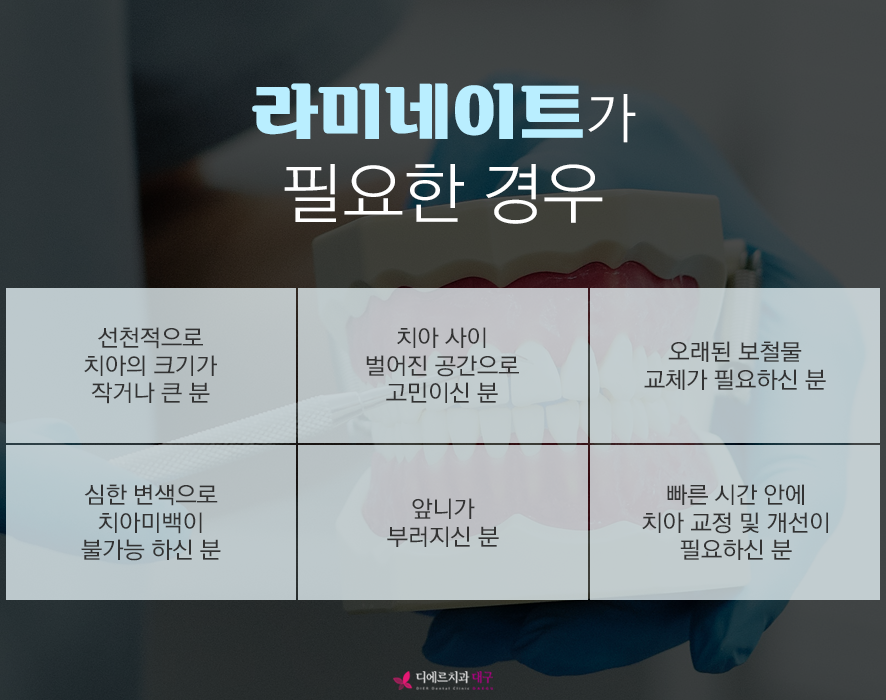 그리고깨진 앞니, 크기가 너무 작거나 큰 치아, 치아 변색이 심해 미백으로 효과를 보지 못하는 경우,