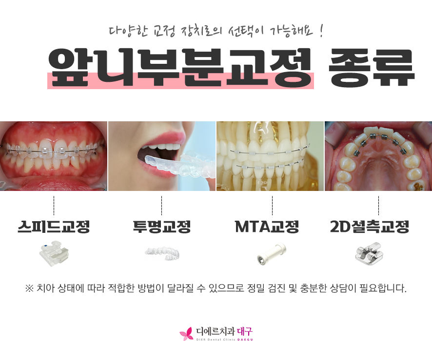 자가결찰교정, MTA교정, 설측교정, 투명교정으로의 선택이 가능하며,