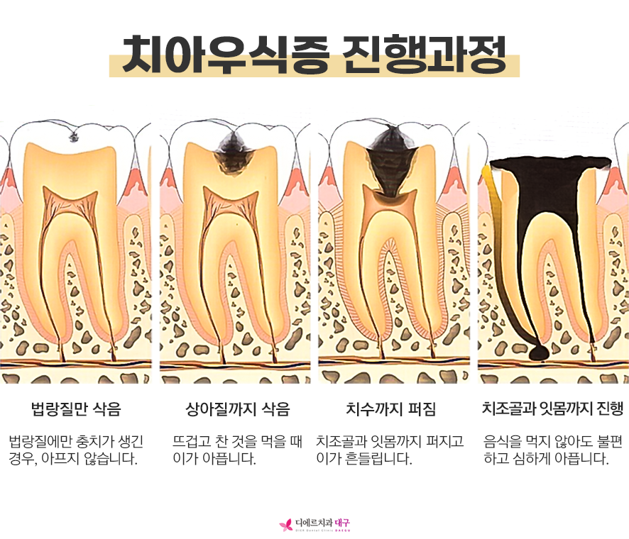 치료를 하지 않고 계속 방치할 경우 충치가 신경까지 이어져 결국 발치에 이르는 사태가 생길 수 있으니 가볍게 여기지 않고 주의해야 합니다.