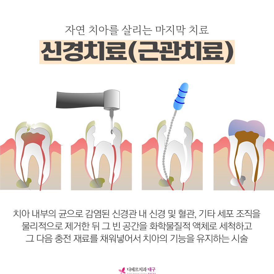 근관치료는 우리가 신경치료라고 알고 있는 치료 방법을 말하며 충치로 감염된 치수를 제거하고 치과 재료로 채워 넣은 것을 말합니다.