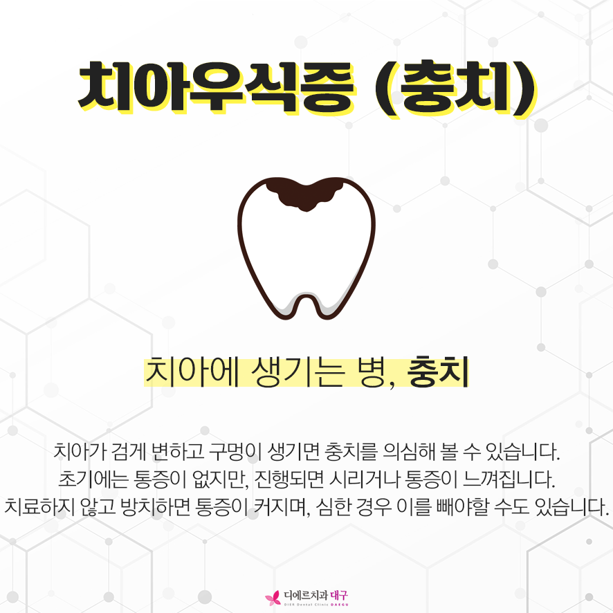 충치는 치아가 썩어 저작기능을 하지 못하는 상태를 말하며, 주로 칫솔이 잘 닿지 않는 부위나 음식물이 잘 끼는 부위와 치아 사이에 발생합니다.