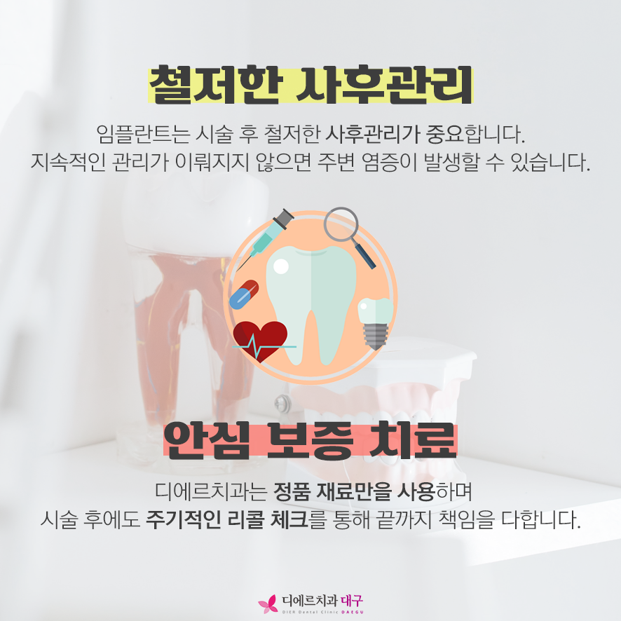 아무리 정확하고 완성도 높은 임플란트 식립이 됐다고 하여도 사후 유지 단계에서 소홀해지면 부작용이 나타날 수 있습니다.