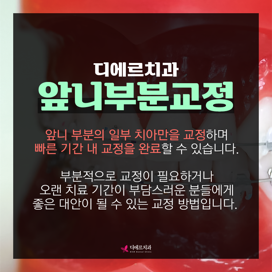 앞니교정은 앞니 부분의 일부 치아만을 가지런하게 만드는 치아교정 방법으로