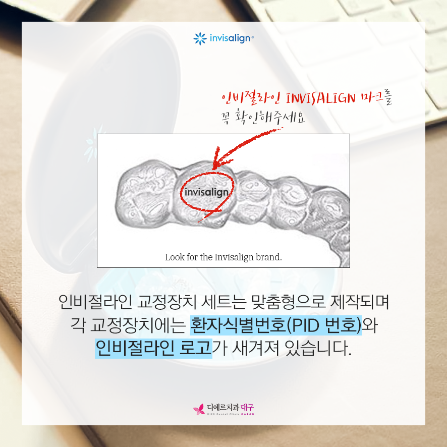 인비절라인 교정장치 세트는 개인 치아 맞춤형으로 제작되고 각 교정 장치에는 환자 식별 번호(PID 번호)와 인비절라인 로고가 새겨져 있습니다.