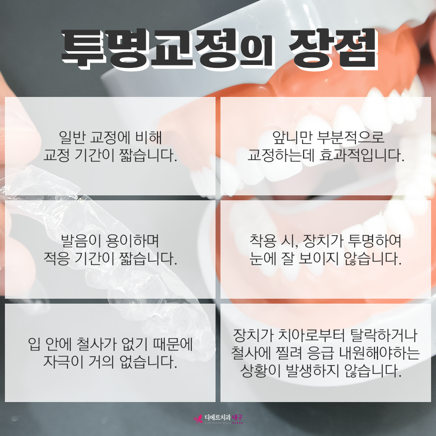 투명교정은 눈에 띄지 않는 얇은 투명 틀을 사용하기에 심미적인 부분과 교정 효과에 대한 만족도가 높아 직장인, 연예인, 취업 준비생 등에게 인기가 있습니다. 단, 치열이 심하게 틀어져 있거나 부정교합이 심할 경우 투명장치만으로 개선이 어려울 수 있어 전문의와 충분한 상담과 검사가 필요합니다.
