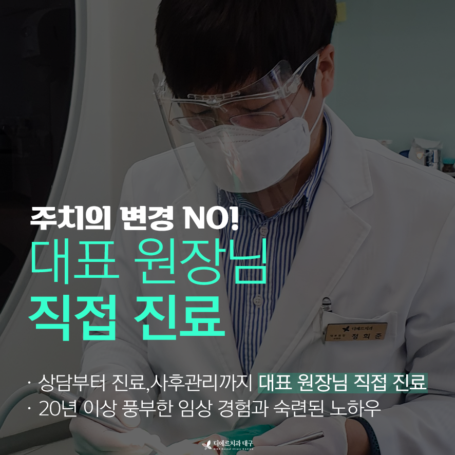 20008년 개원한 디에르치과는 20년 이상 임상경험의 정희준 대표 원장님이 진료하고 있습니다.