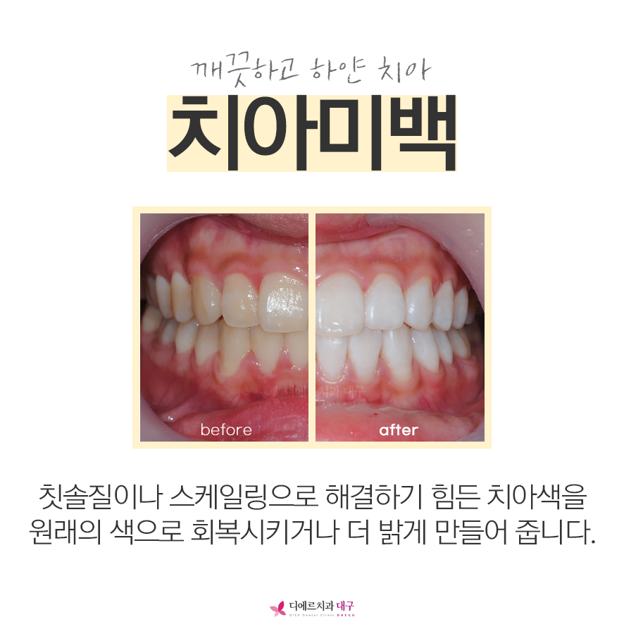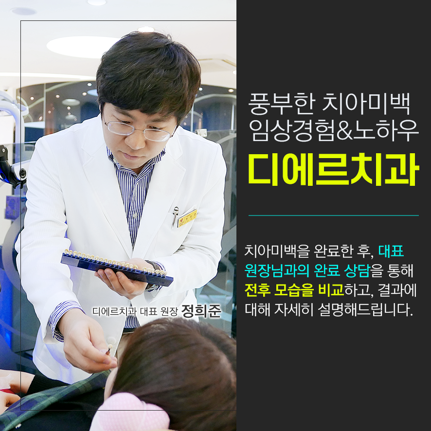 디에르치과는 2008년 개원하여 대구의 중심 동성로에서 15년 이상 진료 중이며 풍부한 치아미백 임상 경험과 노하우를 갖추고 있는 믿을 수 있는 치과 입니다.