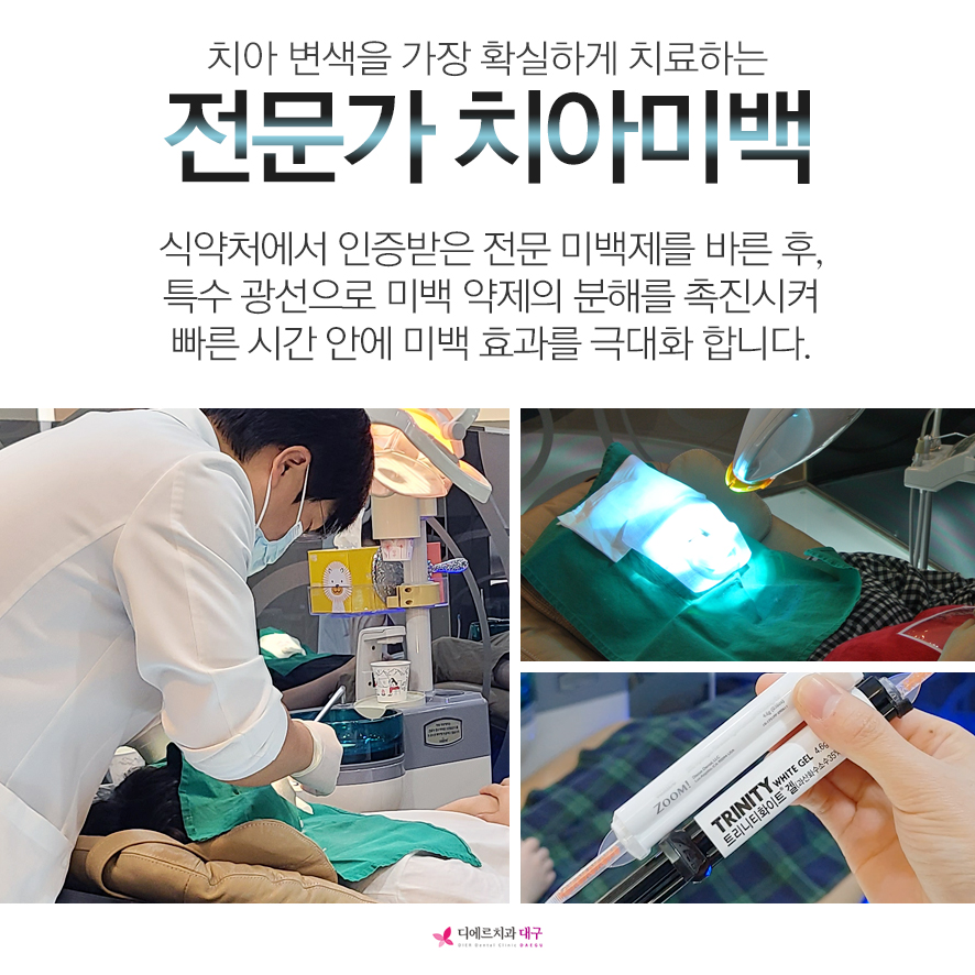 디에르치과는 풍부한 대구 치아미백 임상 경험과 노하우를 지니고 있으며, 식약처에서 인증받은 정품 미백제를 사용하는 믿을 수 있는 치과입니다.