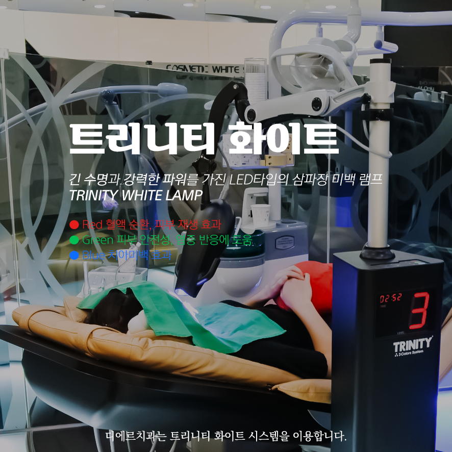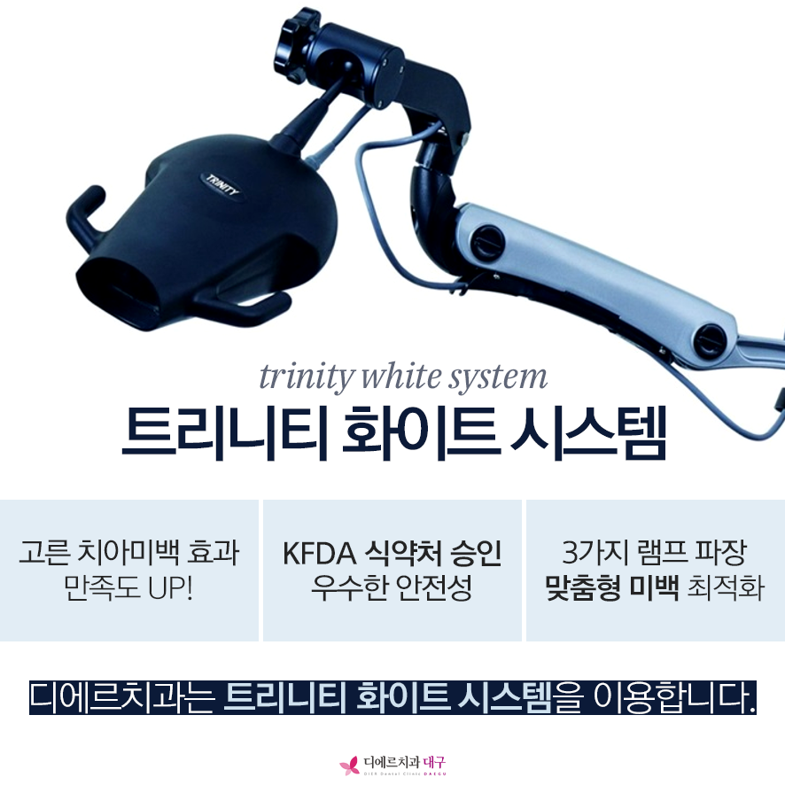대구치아미백은 식품의약안전청 KFDA의 승인을 받은 트리니티 화이트 시스템을 사용합니다.