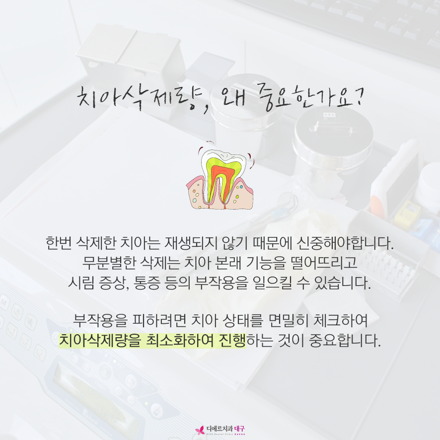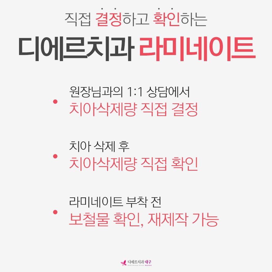 만약 무삭제가 불가능하고 치아 삭제를 해야하는 경우에는 치아 삭제량을 최소화하여 자연 치아를 보존하여 안전하게 진행합니다.