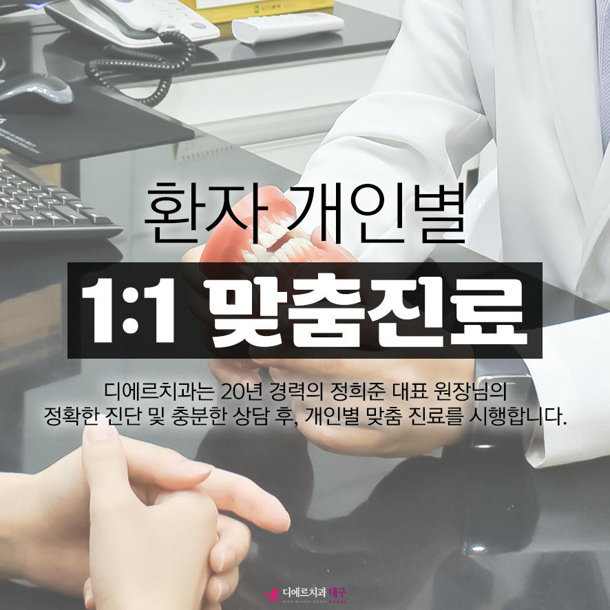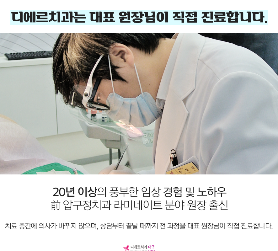 디에르치과는 치료 도중 의사가 바뀌지 않으며 상담부터 치료가 완료될때까지 전과정을 대표 원장님이 직접 진행 합니다.