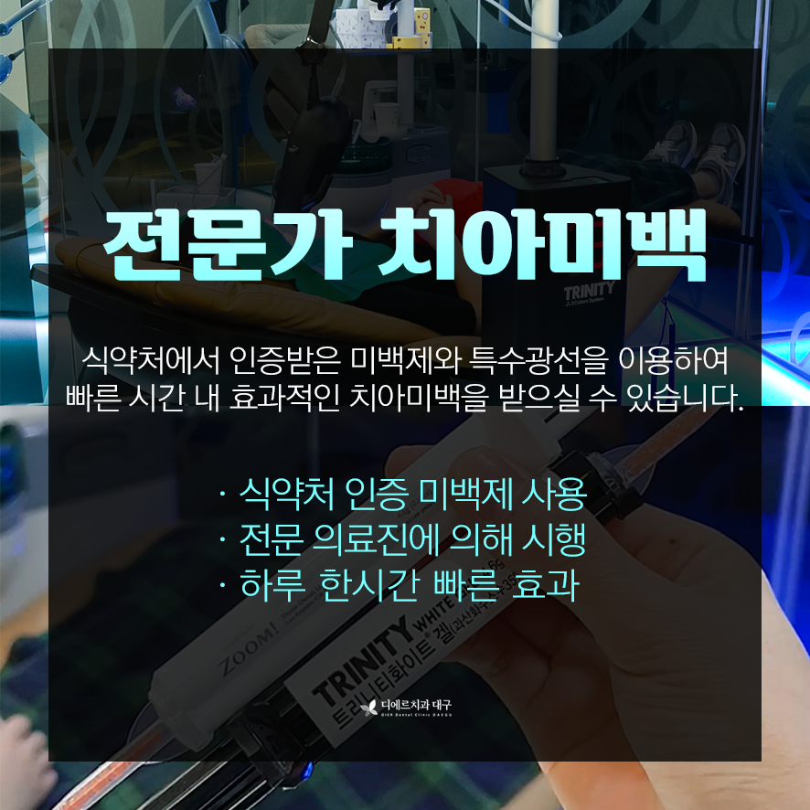 디에르치과는 KFDA의 승인을 받은 안전한 전문가용 트리니티 화이트 시스템을 이용합니다.