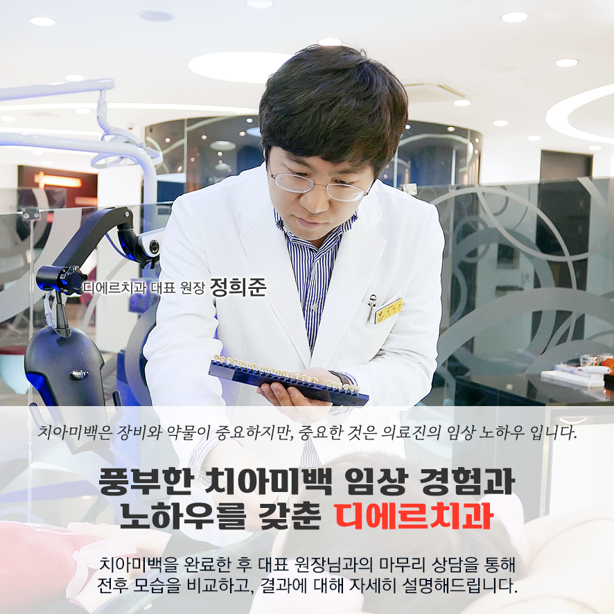 디에르치과는 풍부한 치아미백 임상 경험과 노하우를 지닌 미백치과이며, 2008년 개원하여 15년 이상 한자리에서 진료를 하고 있는 믿을 수 있습니다.