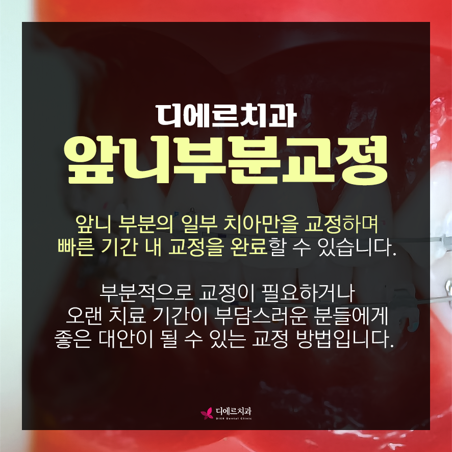 최근에는 치아교정술이 발달하고 빠른 교정을 원하는 사람들이 늘면서 앞니 부분교정이 관심을 받고 있습니다. 필요한 부분에만 교정 장치를 장착해 전체 치아교정에 비해 상대적으로 짧은 치료 시간이 소요됩니다.