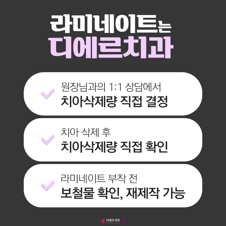 라미네이트는 단순 심미성 개선을 통한 미용적 목적 외에도 치아 배열 개선과 치아 결손 회복을 통해 건강한 구강을 되찾는데도 목적이 있습니다. 따라서 면밀한 상담을 통해 살피는 것이 중요하며 라미네이트 임상 경험이 풍부한 숙련도 높은 치과의사를 찾는 것이 좋습니다.