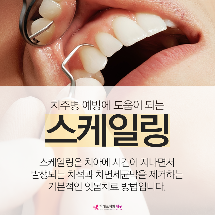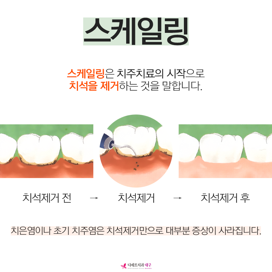 이처럼 치석 때문에 생기는 치주질환을 사전에 예방하기 위한 가장 좋은 방법이 바로 스케일링입니다. 스케일링을 하면 치아 표면에 눌러 붙은 플라크, 치석을 제거할 수 있습니다. 또 치아 표면을 매끈하게 해서 유해한 세균의 수가 줄고 구강을 늘 청결한 생태로 유지할 수 있습니다.