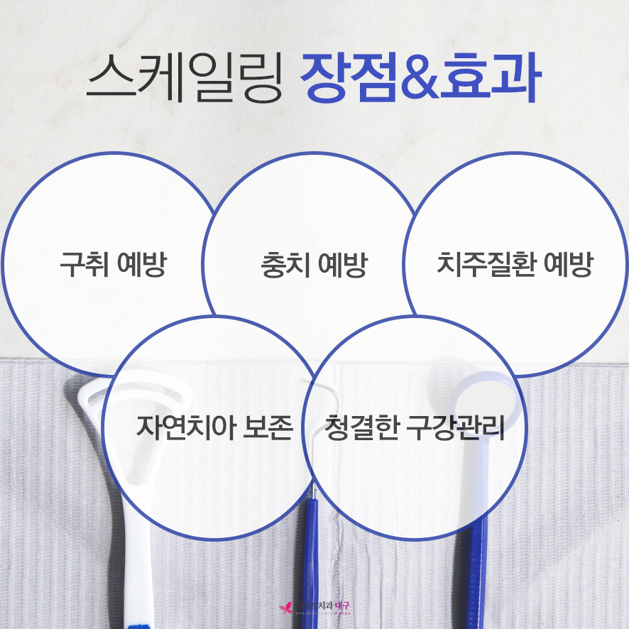 스케일링을 정기적으로 받으면 칫솔질로 완전히 제거되지 않는 음식물 찌꺼기, 프라그, 치석, 카페인, 니코틴 등을 제거할 수 있고, 초기 치은염이나 치주염을 예방할 수 있으며, 입 냄새를 제거에도 도움이 됩니다.