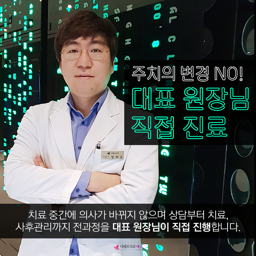 디에르치과는 15년 이상의 풍부한 임상 경험과 노하우를 지닌 대표 원장님께서 상담부터 치료가 끝날 때까지 전과정을 직접 진료하고 있습니다. 치료 중간에 의사가 바뀌지 않으며, 2008년 개원 이후 10년 이상 계속 정희준 대표 원장님이 진료하고 있습니다.