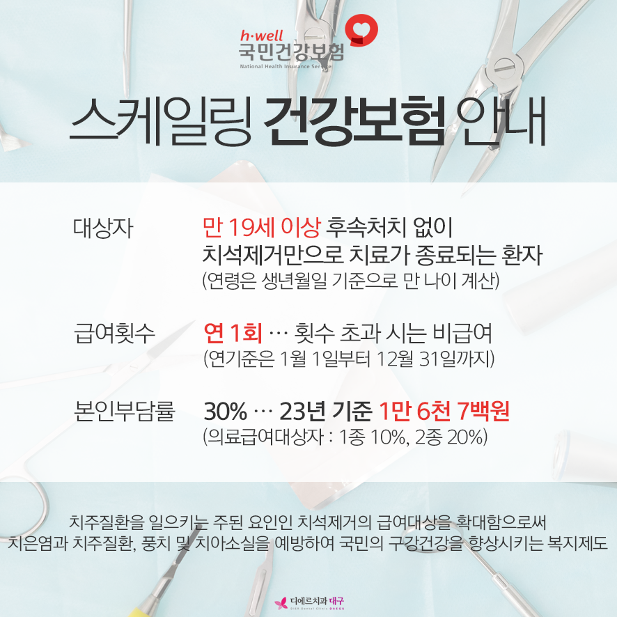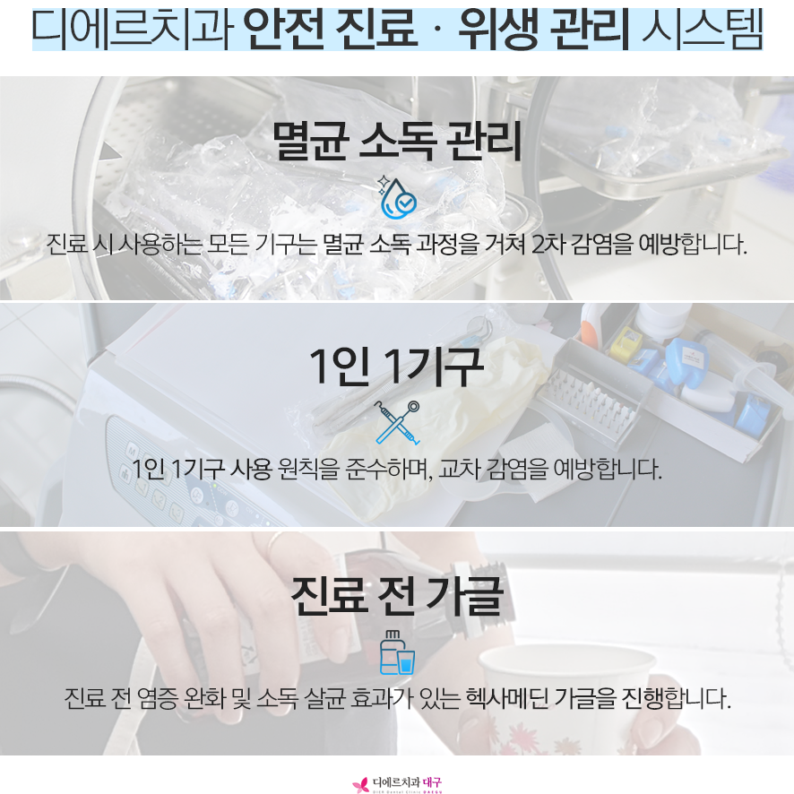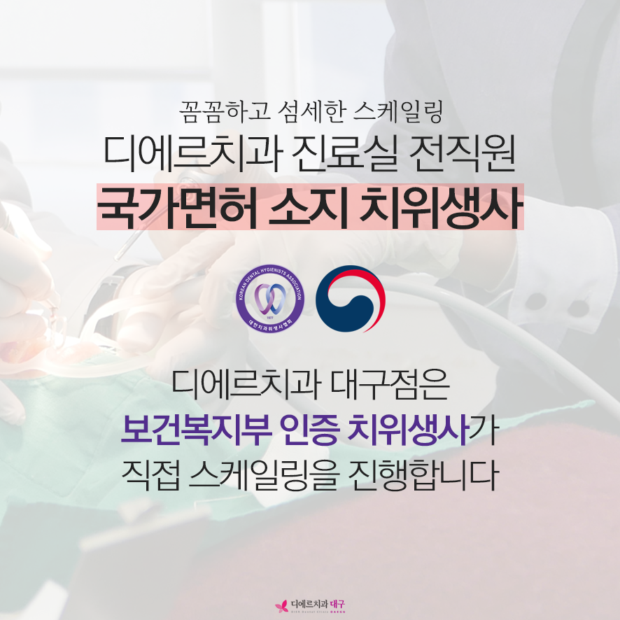 안전한 꼼꼼한 스케일링을 위해 조무사가 아닌 치위생사가 진행하는 치과인지 확인해야 합니다. 디에르치과 대구 스케일링은 보건 복지부 인증을 받은 치위생사가 스케일링을 진행하고 있습니다.