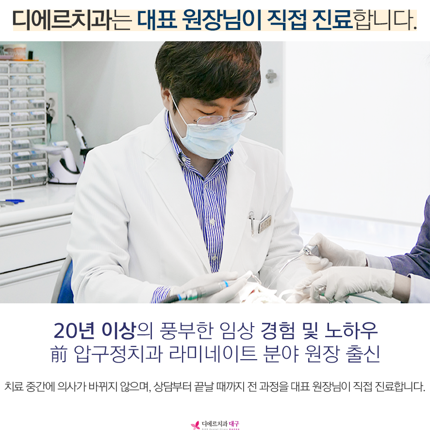 치아를 손상시키지 않고 자연 치아를 보존하면서, 심미성이 중요한 치료인 만큼 임상 경험이 풍부한 의료진에게 진료를 받는 것이 좋습니다. 디에르치과 정희준 대표 원자님은 前 압구정 치과 라미네이트 분야 원장 출신으로 아직도 서울을 비롯하여 전국 각지에서 많은 분들이 내원해 주고 계십니다.