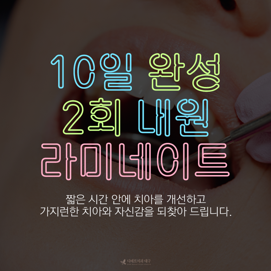 무엇보다 빠트릴 수 없는 라미네이트의 장이 바로 빠른 기간 내 치료가 완료된다는 점입니다. 10일 2회 내원 정도면 모든 치료가 완료됩니다. 장기간의 시간 투자가 필요한 치아교정이 부담스러우시다면 라미네이트를 통해 빠르게 급속교정의 효과를 확인할 수 있습니다.