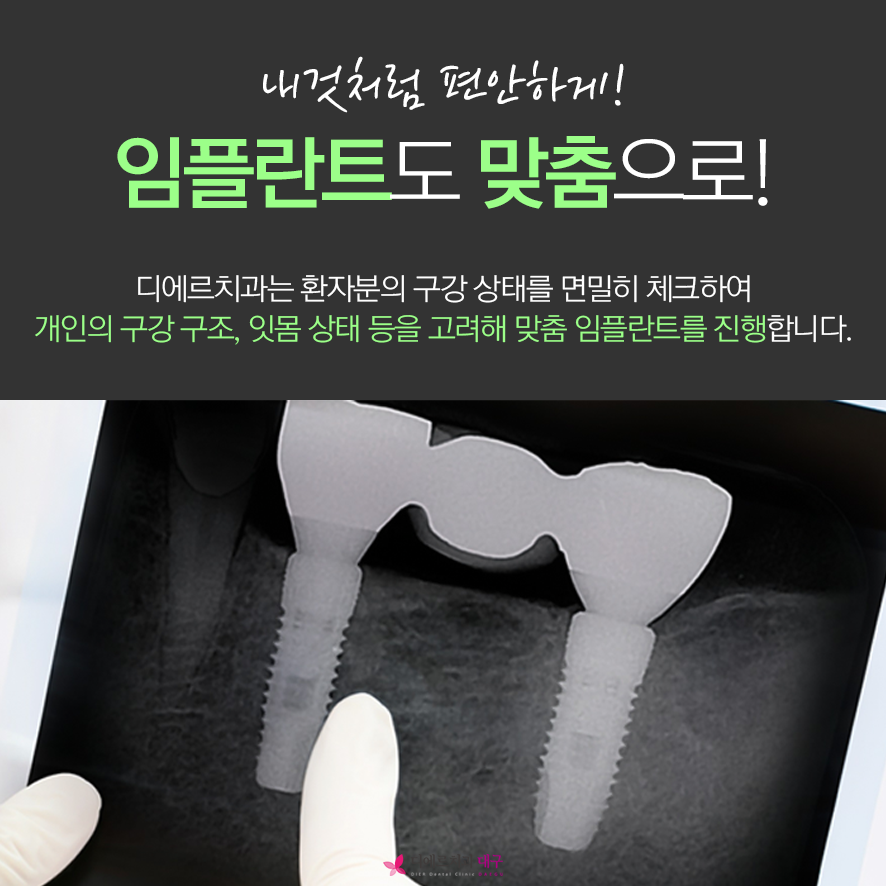 디에르치과는X-ray와 3D-CT 등의 디지털 장비를 통한 정밀 분석과 대표 원장님과의 충분한 상담을 통해 맞춤 임플란트로 진행합니다.