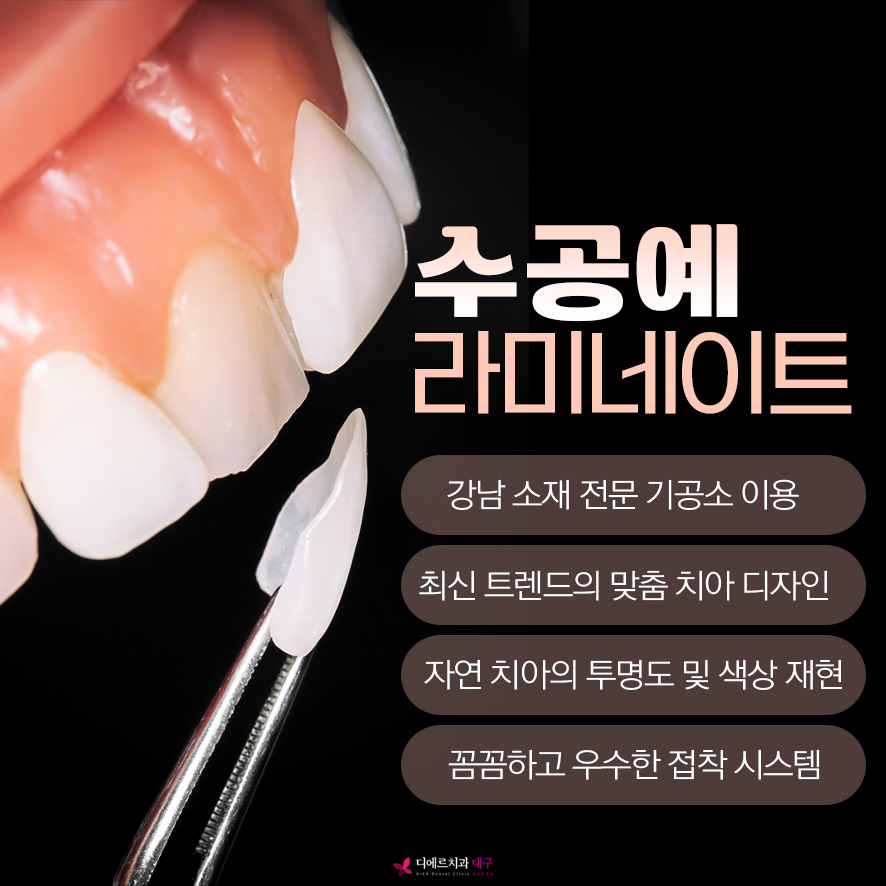 디에르치과의 라미네이트는 수공예 라미네이트로 제작하여 보다 섬세하고 견고한 디자인으로 만족도가 높고 자연치와 매우 유사합니다.
