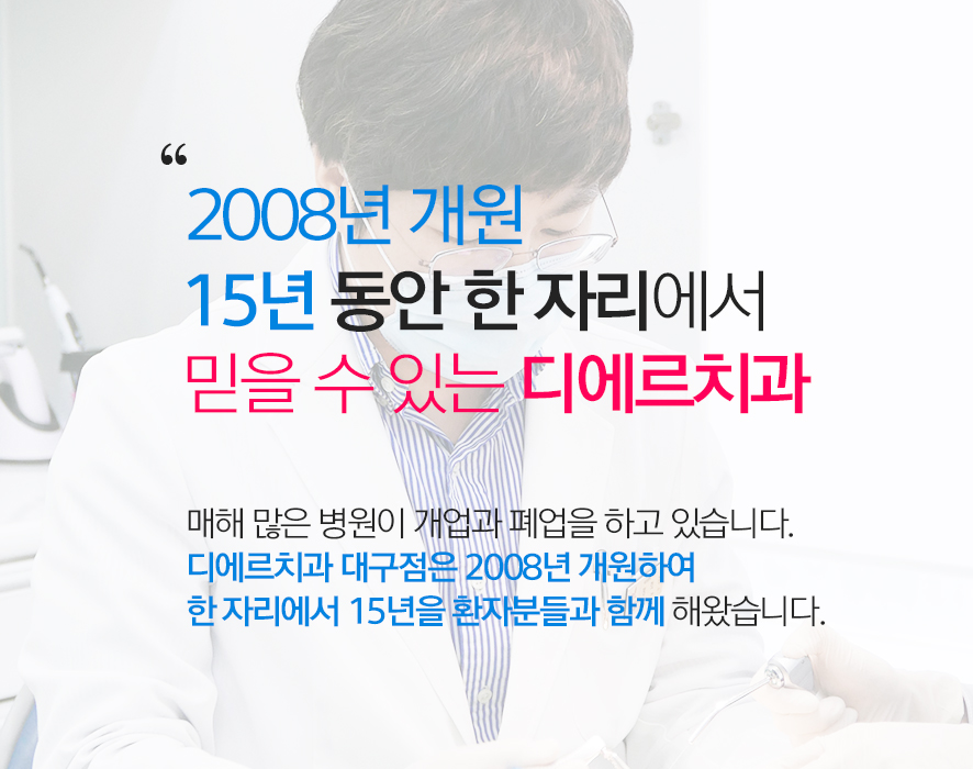 본원은 2008년 개원하여 동성로 한자리에서 진료를 하고 있습니다. 20년 이상의 경험을 지니신 대표 원장님께서 상담부터 진료가 끝날 때까지 전과정을 직접 진행하고 있으며, 대표 원장님의 단독 진료로 진료 중간의 의사가 바뀌지 않습니다.