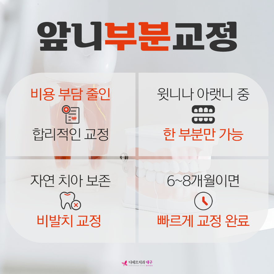 그리고 위아래 치아 중 한 부분만 교정을 하는 것도 가능하며, 발치를 하지 않아 자연 치아를 보존합니다.