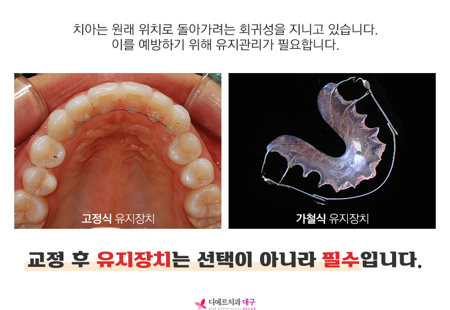 따라서 교정이 마무리되고 난 후 초기 1년 정도는 치아 주변 조직이 안정화될 때까지 유지 장치를 착용해야하며, 주기적으로 치과를 내원하여 검진을 받아야 합니다.