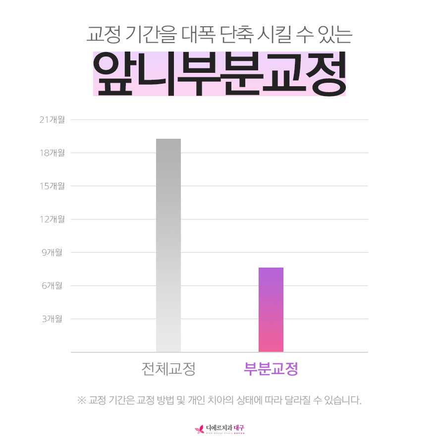 보통 2년 정도 걸리는 전체 교정에 비해 치료 기간을 대폭 줄일 수 있습니다.
