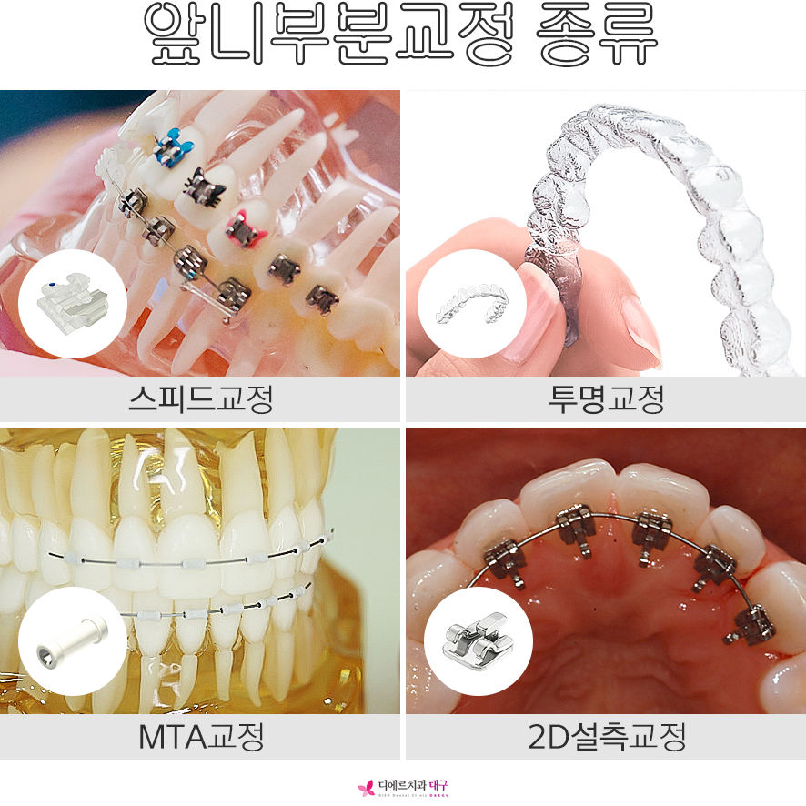 자가결찰교정, MTA교정, 설측교정, 투명교정으로의 선택이 가능하며, 심미적인 부분까지 보완할 수 있습니다.