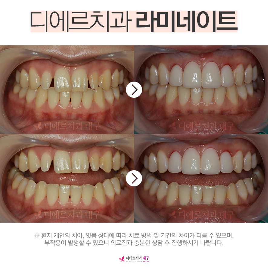 라미네이트는 치아의 배열, 치아의 크기, 색상, 모양, 각도 등을 수정할 수 있습니다.