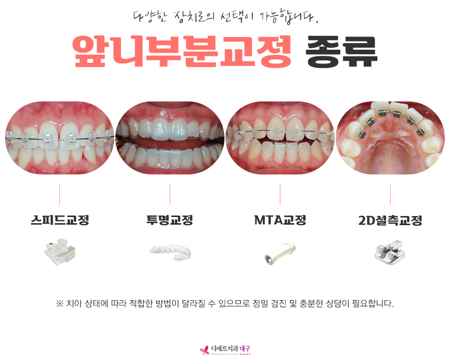 자가결찰장치를 사용하여 빠르게 치아를 이동시키는 스피드 교정, 투명한 재질의 탈착이 가능한 투명교정