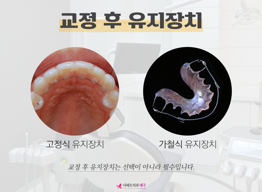 치아교정 후 올바른 유지 관리를 해주어야 치아가 다시 되돌아가는 재발을 방지하기 위해 유지 장치를 착용합니다.