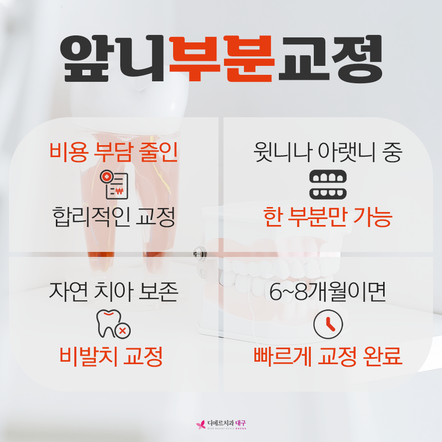 하지만 앞니 부분교정을 통한 치아교정은 치료 기간을 절반으로 단축시킬 수 있습니다.